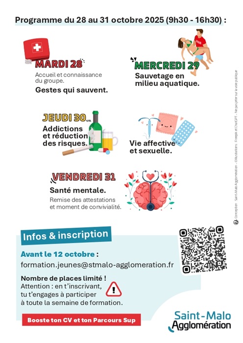 Inscriptions jusqu’au 12 octobre auprès de la Direction de la Cohésion et de l’accompagnement des Populations : formation.jeunes@stmalo-agglomeration.fr ou via le site internet de Saint-Malo Agglomération.